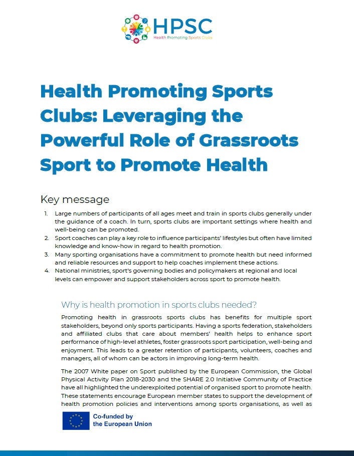 Sports coaches play a key role in participants’ sports experiences and can positively influence their social, mental, and physical health. Nevertheless, sports coaches are often volunteers and may benefit from knowledge and support regarding the fostering of their sports participants’ health and well-being, beyond the technical and tactical aspects of sport. The Health Promoting Sports Coach implementation guide provides practical advice to coaches on how to integrate health promotion into their coaching. This tool is seperated into three sections: 1) theoretical background, 2) a practical checklist for coaches to promote health and 3) long-term strategies to implement health promotion within coaching. This practical guide helps coaches to implement health promotion comprehensively, through their actions and relationships with sports participants and other stakeholders throughout the sports club setting.